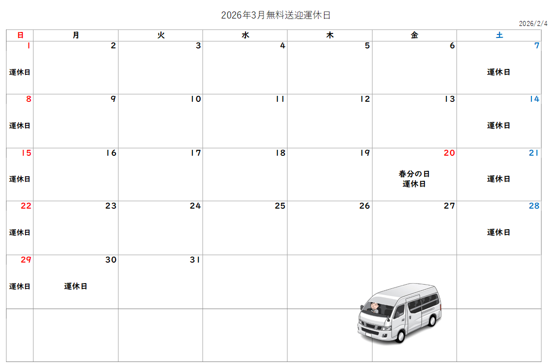 2026年3月無料送迎運休日カレンダー